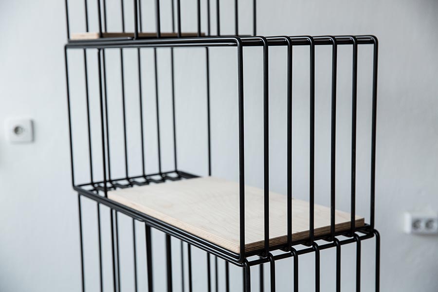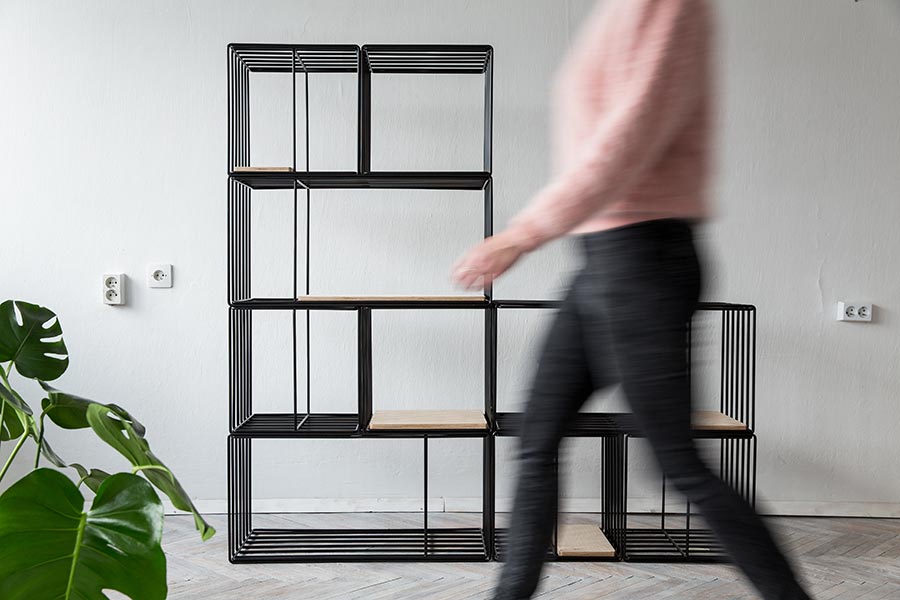 Due to its modular structure, any user can form the final shape of PROM. The bookcase consists of three different kinds of modules supplemented by wooden shelves, allowing for an almost limitless variety of configurations. We can compile each module separately and link in compiled modules creating thus an openwork wall unit.