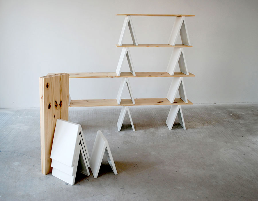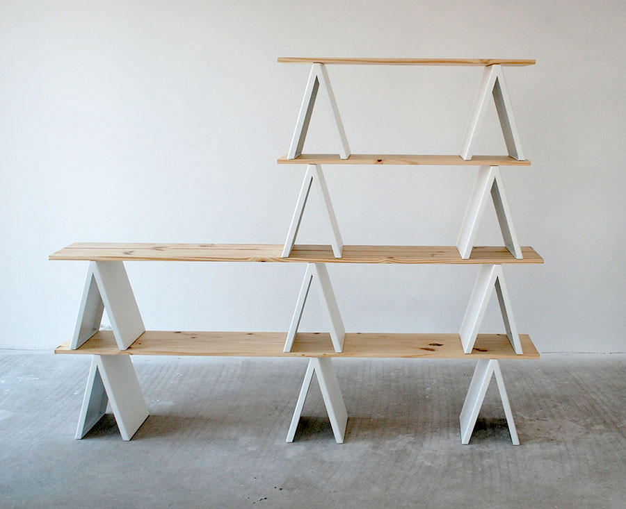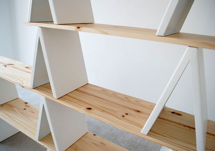 It’s a two-module system consisting a metal support and a wooden shelf, allowing unlimited ways to craft a wall unit.