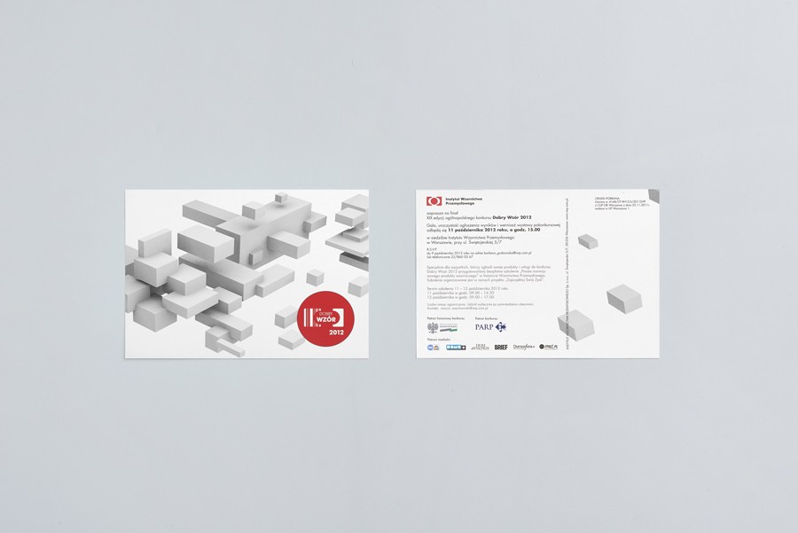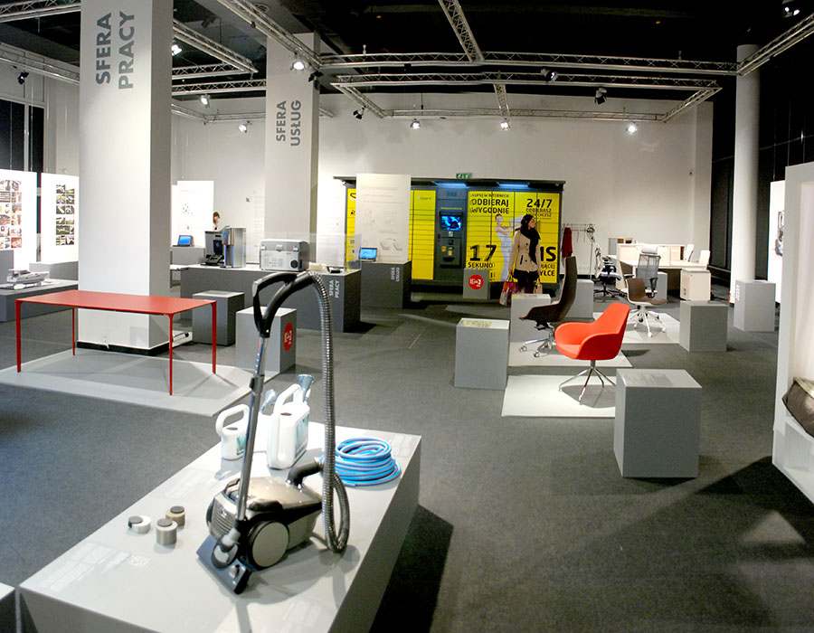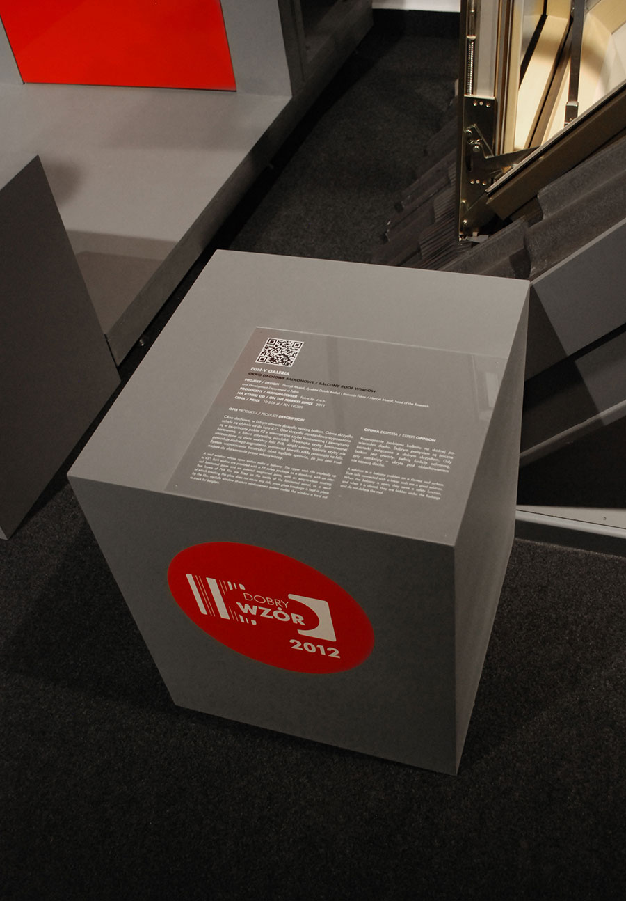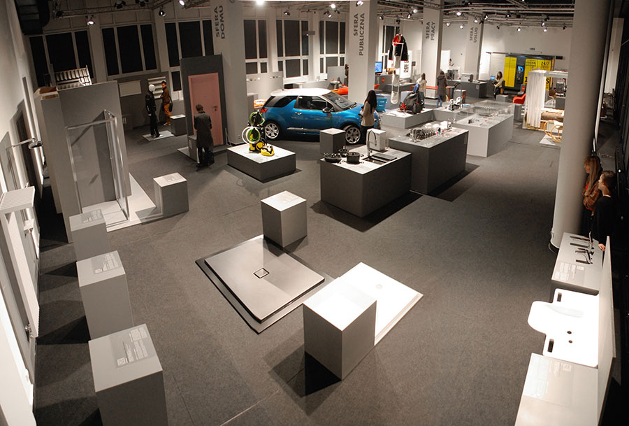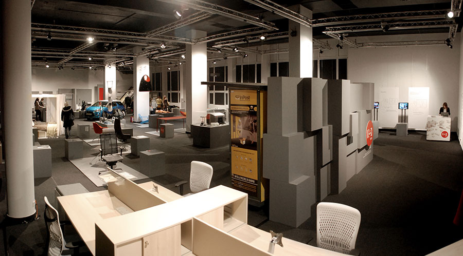 Podobnie jak w roku 2011, projektując tegoroczną wystawę Dobry Wzór, zastosowaliśmy system dzielenia przestrzeni na moduły i wpisywania w nie wystawców. Szary kolor ekspozytorów był bardzo dobrym tłem dla prezentowanych kolorowych produktów. Czerwone detale ożywiły całą kompozycję.