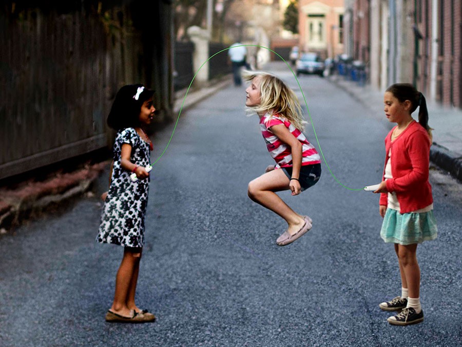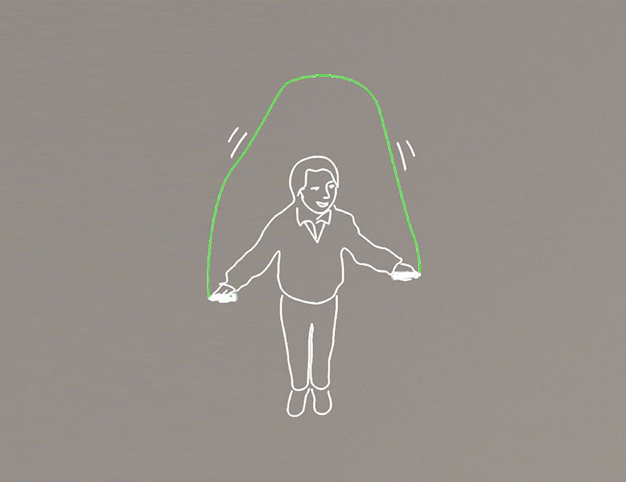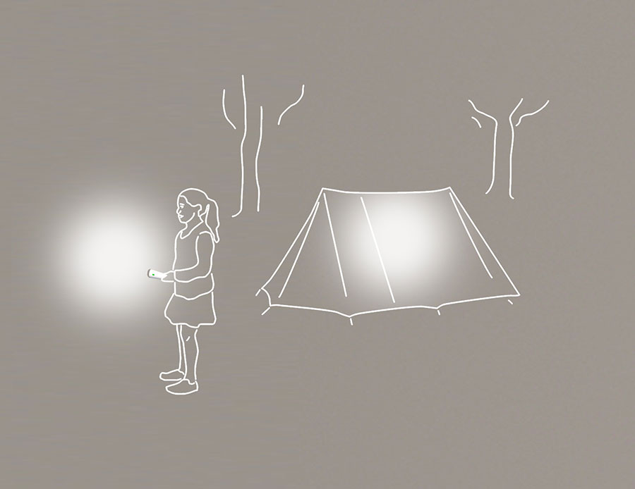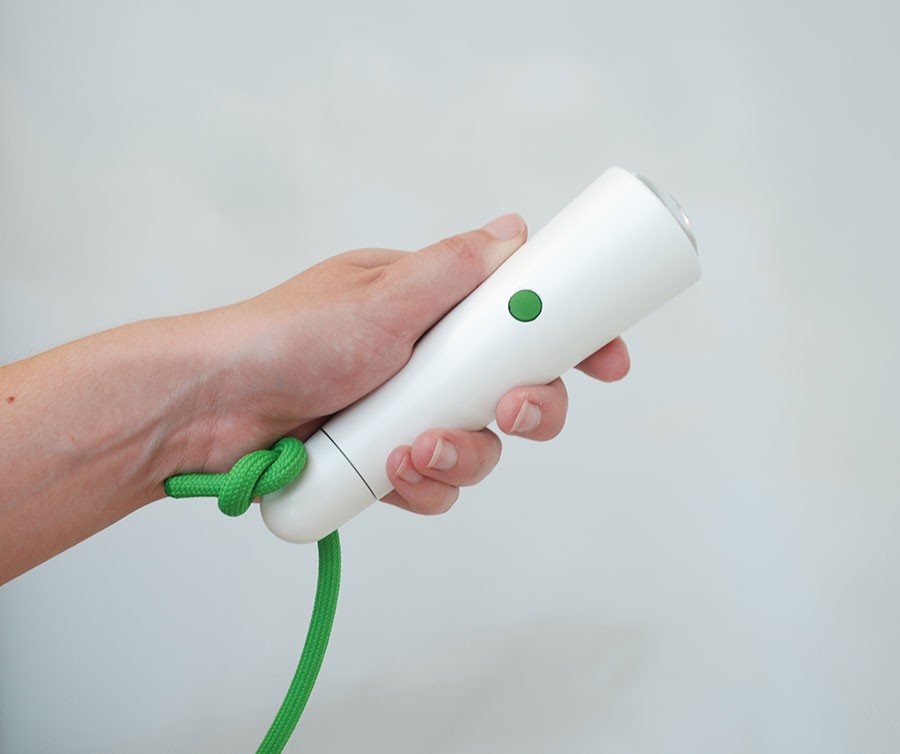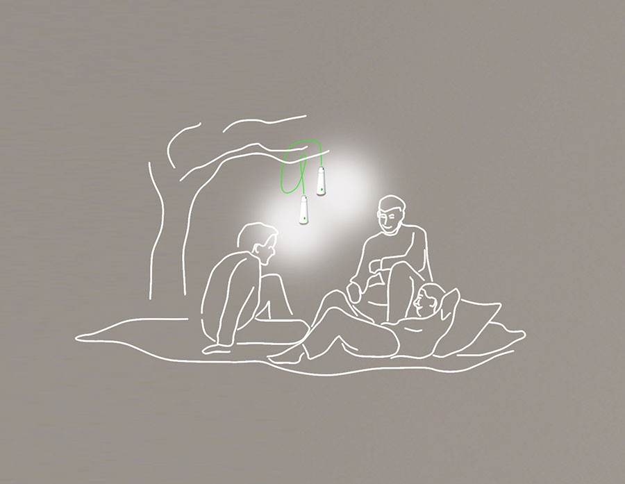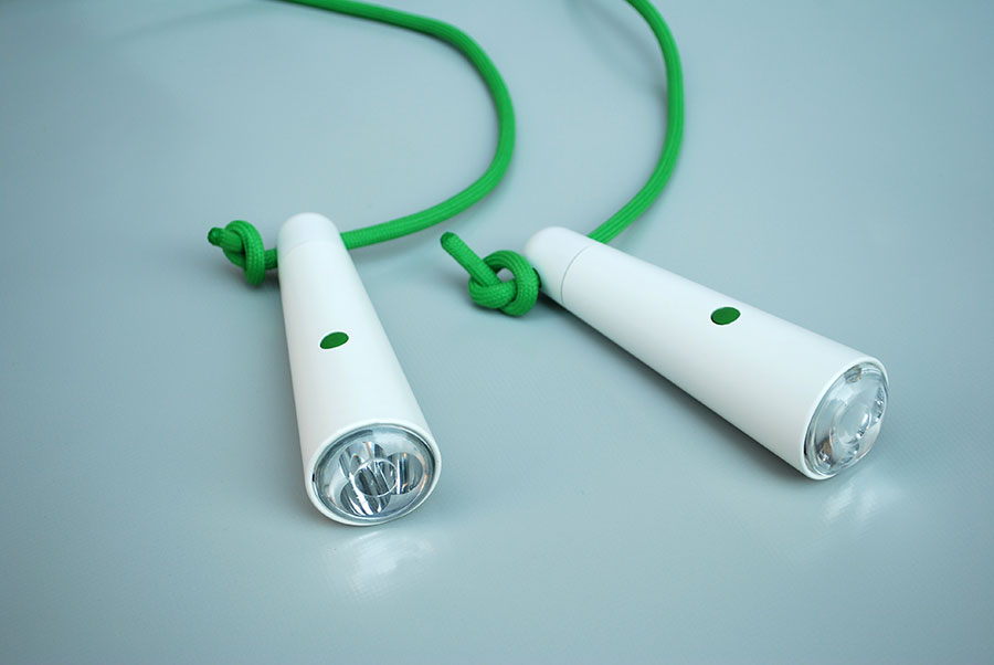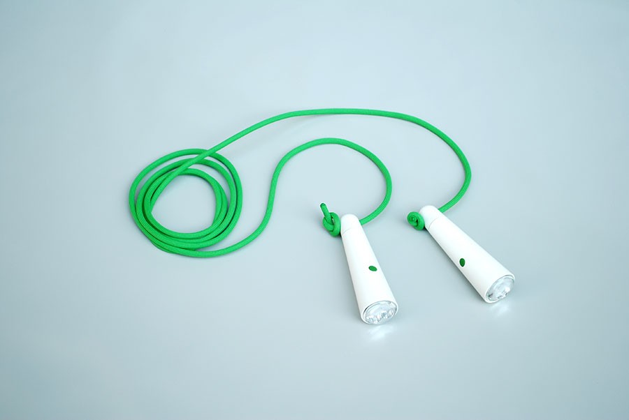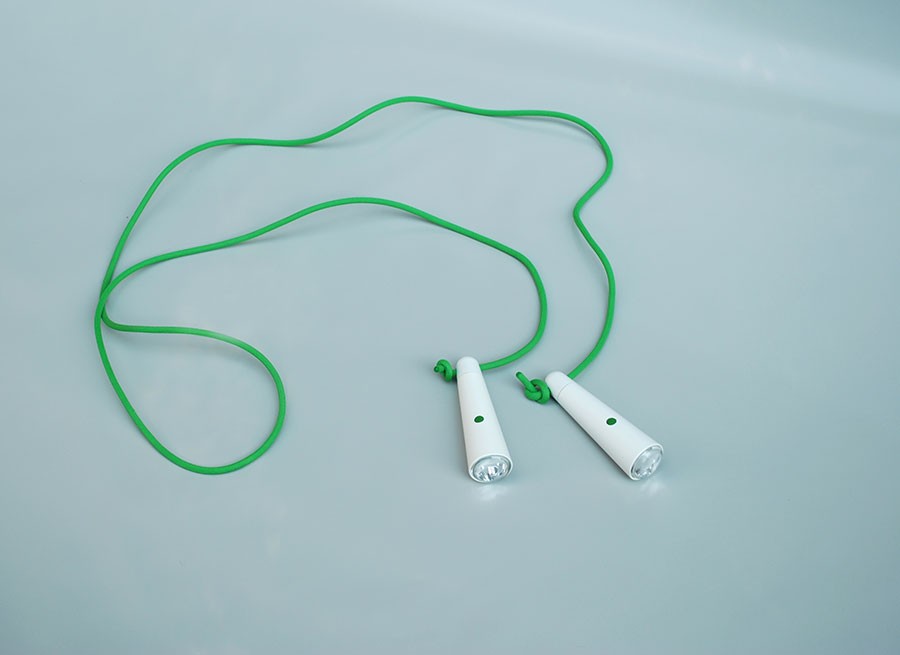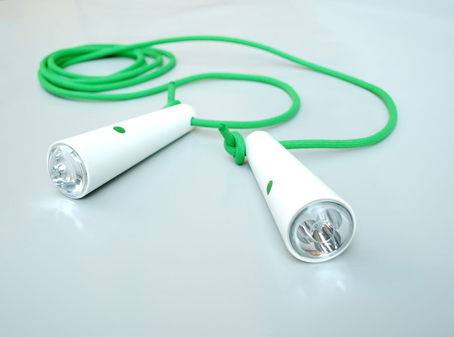 It’s a jump rope flashlight that recharges during play, thanks to handle-mounted dynamos and LED lights. The spinning rope generates electricity that is stored in batteries (also in the handles). The design allows the lamp to be hung e.g. in porches or tents. The rope can be untied, creating two light sources.